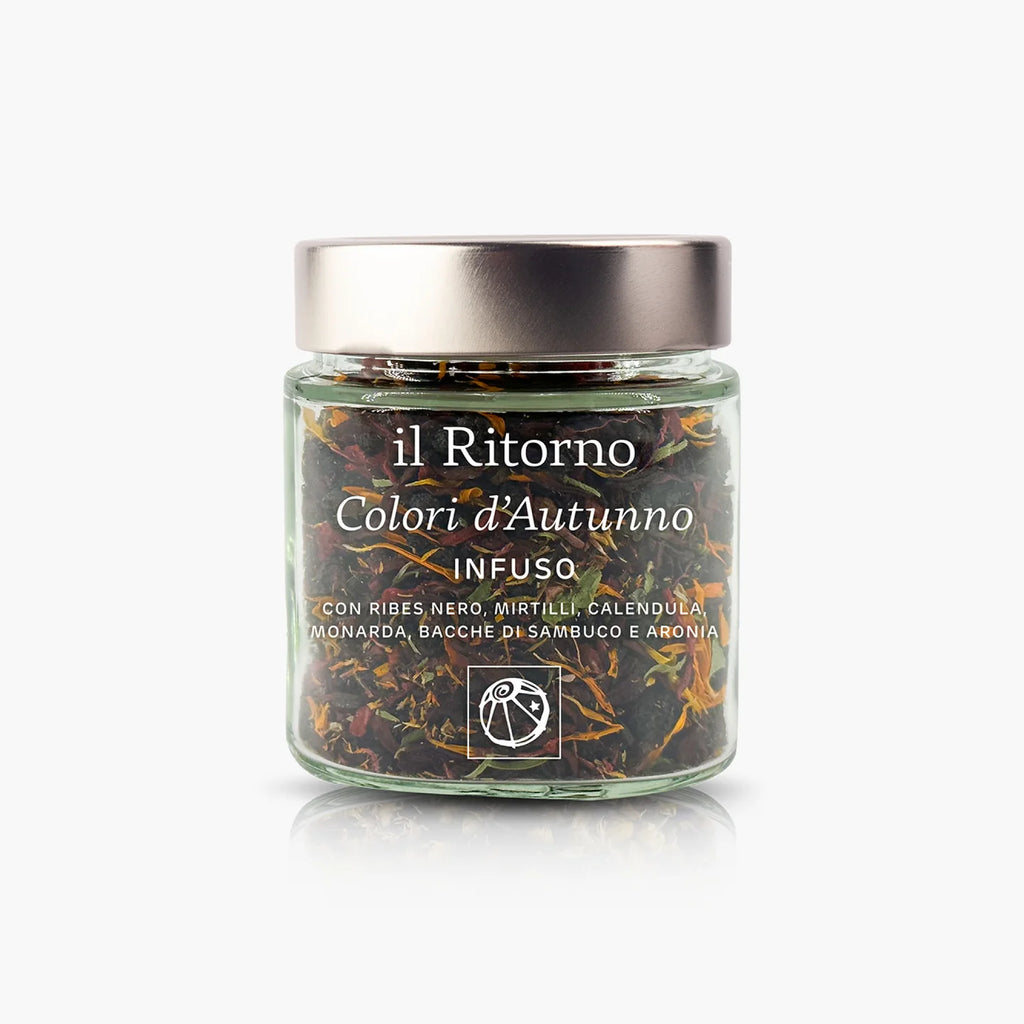 Colori d'autunno: Fiori di ibisco, bacche di sambuco, bacche di aronia, ribes nero, aromi, mirtilli, calendula, monarda