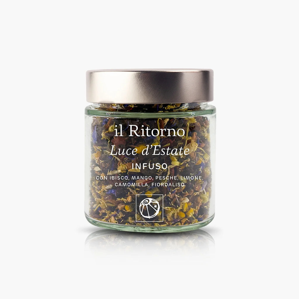 Luce d'estate: Fiori di ibisco, rosa canina, mango, mele, scorze di limone, pezzi di pesche 1,5%, fiordaliso, aromi, camomilla