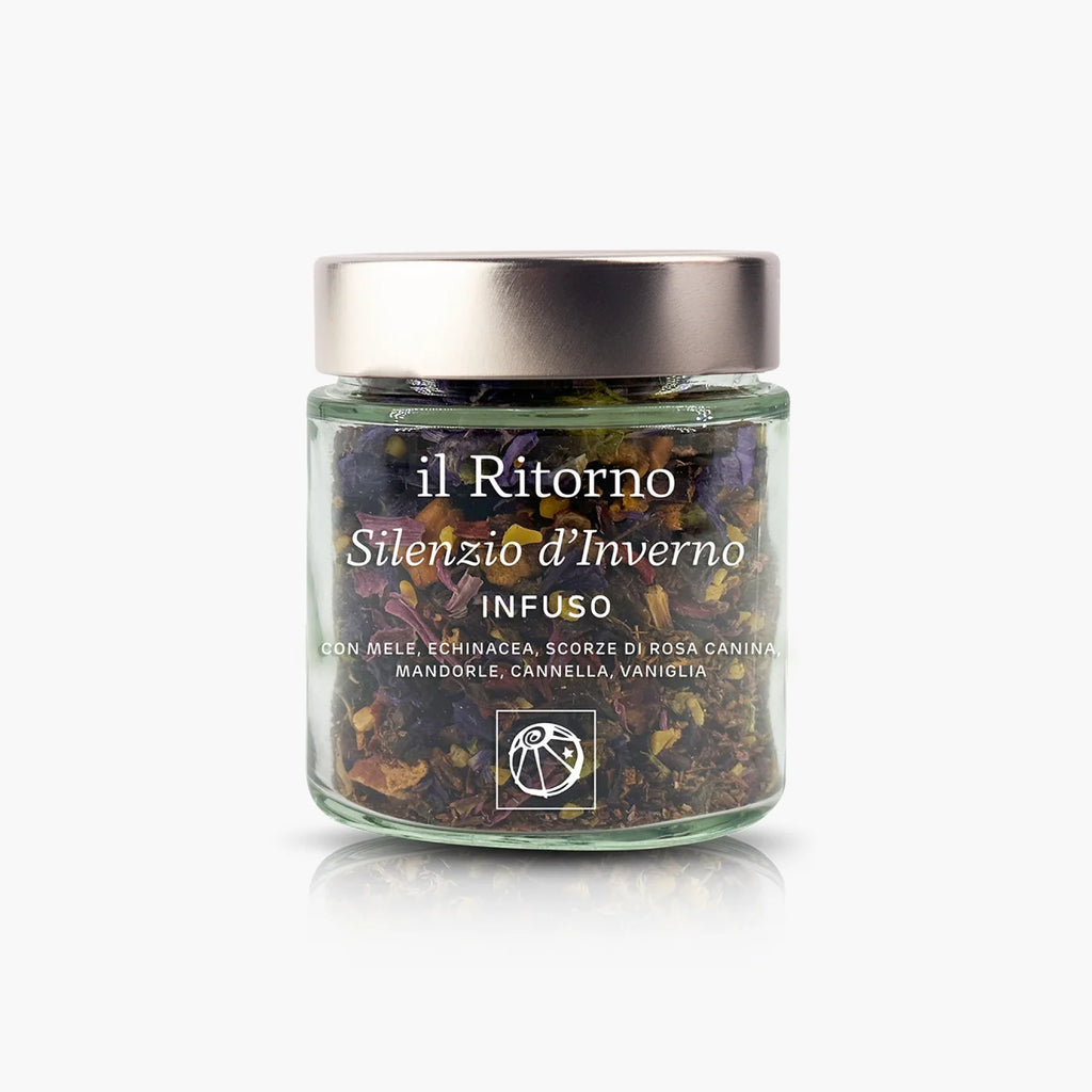 Silenzio d'inverno: Mela, fiori di ibisco, scorze di rosa canina, mandorle, cannella, rooibos, aroma, pezzi di vaniglia, echinacea, malva.