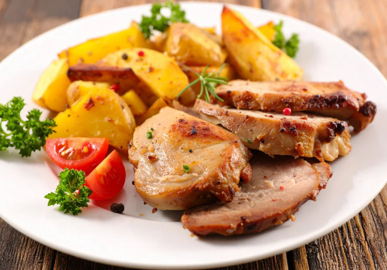 lonza di maiale, cipolla, vino bianco, olio EVO, aglio, sale, pepe, rosmarino, salvia, farina di riso - patate, olio EVO, aglio, rosmarino, sale, pepe