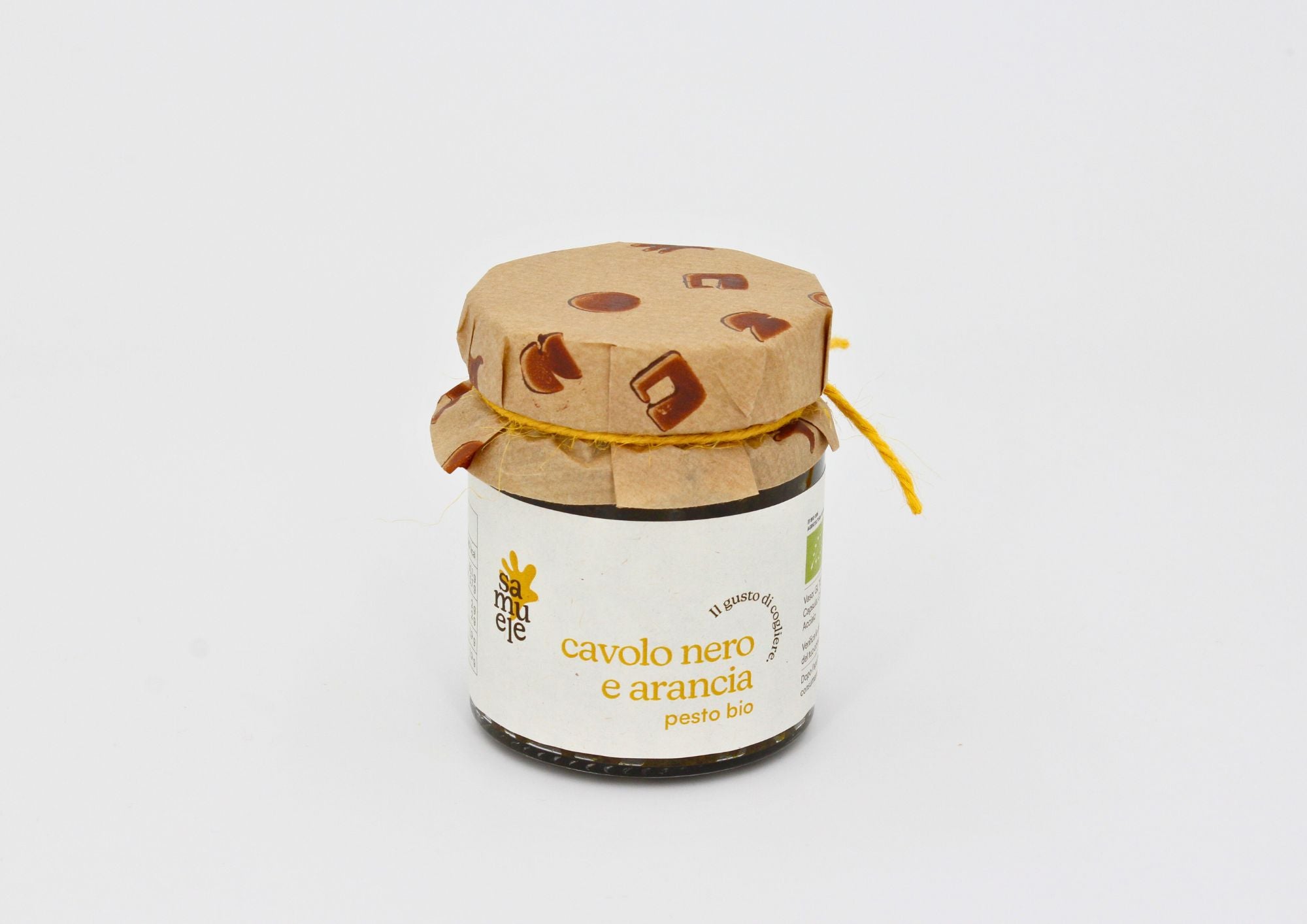 Ingredienti: Cavolo nero (45%), olio di semi di girasole, olio e.v.o.*, mandorle (7%), scorze di arancia (0,7%), aglio*, sale.