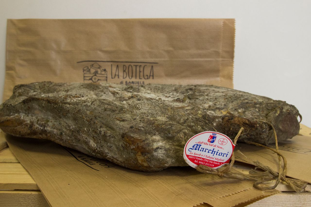 SPECK DAL SAPORE E IL PROFUMO UNICO DELL'ALTA VAL DI NON. AFFUMICATO AL GINEPRO E STAGIONATO PER MINIMO 9 MESI. OTTIMO TAGLIATO AL COLTELLO. CONFEZIONE SOTTOVUOTO. PESO STIMATO 500 g